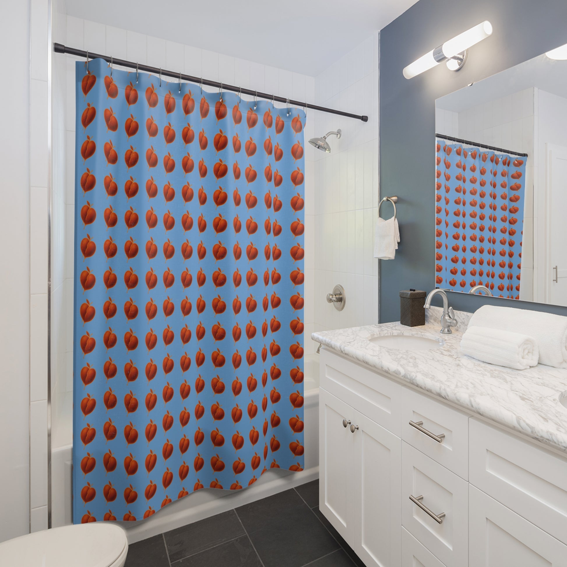 Transform your bathroom into a vibrant retreat with this delightful shower curtain! Featuring a playful pattern of red peaches against a serene blue backdrop, this product brings a fresh and fruity vibe to your space. Perfect for those who love to add a touch of whimsy to their home decor, this shower curtain is not just a practical necessity but also a statement piece that brightens up your daily routine. Ideal for fruit lovers and anyone looking to refresh their bathroom aesthetic, it’s a great gift for housewarmings, birthdays, or as a cheerful addition to seasonal decor. Perfect for sunny spring or summer days, this shower curtain invites a feeling of joy and relaxation into your home.